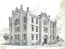 John M. Van Osdel and Frederick Baumann were tasked with planning the structure. They designed a Gothic Revival building faced with ashlar limestone. It had diamond-shaped leaded windows and crenelated roof edges.[3] An examination for application was opened on July 15, 1856, with 158 applicants; 114 were admitted. A second examination was held and eleven others were admitted. The school was officially organized on October 8, 1856, and Charles A. Dupee was named the first principal. By the start of the winter term, only fifty-one student were able to maintain a scholarship.[1] The Irving Society, a literary club named for Washington Irving, was founded in 1857.[3]