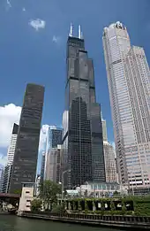 Chicago has a famous skyline which features many of the tallest buildings in the world as well as the Chicago Landmark Historic Michigan Boulevard District. Chicago's skyline is spaced out throughout the downtown area. The Willis Tower, formerly known as the Sears Tower, the second tallest building in the Western Hemisphere, stands in the western Loop in the heart of the city's financial district, along with other buildings, such as 311 South Wacker Drive and the AT&T Corporate Center.