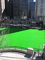 The Environmental Protection Agency (EPA) outlawed the use of fluorescein for this purpose, since it was shown to be harmful to the river.[78] The parade committee has since switched to a mix involving forty pounds of powdered vegetable dye.[80] Though the committee closely guards the exact formula, they insist that it has been tested and verified safe for the environment.[81] The environmental organization Friends of the Chicago River disapproves of dyeing the river, saying the practice "gives the impression that it is lifeless and artificial", adding "Friends doesn’t think that the river should be treated as a decoration for an annual holiday, but treasured and cared for as the wonderful natural and recreational resource it deserves to be".[82]