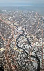 South of Belmont the North Branch is lined with a mixture of residential developments, retail parks, and industry until it reaches the industrial area known as the Clybourn Corridor.[23] Here it passes beneath the Cortland Street Drawbridge, which was the first 'Chicago-style' fixed-trunnion bascule bridge built in the United States,[24] and is designated as an ASCE Civil Engineering Landmark and a Chicago Landmark.