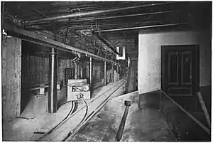 Coal was carried in side-dump cars, from which it was dumped into a hopper below each customer's boiler room. A conveyor then carried the coal up from the trackside hopper to the customer's boiler room.[78] The details of the latter connection depended on the depth of the building's basement. Chicago's new City building on the corner of Washington and LaSalle had a subbasement 38 feet (11.58 m) below sidewalk level, so the tunnel connection was made by a 10-foot-deep (3.05 m) trench.[80] The Commercial National Bank's coal bins were under the sidewalk on Clark Street. There, coal was lifted from the tunnel by a vertical bucket conveyor running in a small shaft.[81]
