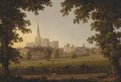 The cathedral has been the subject of a number of depictions in art, literature, and television media. Its spire and towers are visible in the 1828 painting, Chichester Canal, by J. M. W. Turner. It is also speculated, by Eric Shanes, that Chichester Cathedral is the subject of one of Turner's colour studies for Picturesque Views in England and Wales.[26] In 1833, Joseph Francis Gilbert produced an oil painting of the cathedral, showing the surrounding cityscape. It was collected by Paul Mellon and gifted to the Yale Center for British Art, which he established, in 1966.[27] John Constable completed his own watercolour of the cathedral in 1824, now located in the Victoria and Albert Museum in London.[28]