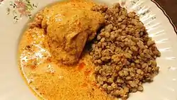 The dish is traditionally served with "dumpling-like boiled egg noodles" (nokedli), a broad noodle similar to the German spätzle.[2][4] Other side dishes that it may be served with include tagliatelle (boiled ribbon noodles),[6] rice or millet.[7]