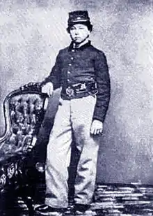 - John Clem joined the 22nd Michigan Volunteer Infantry Regiment as a drummer boy at 11 years of age, (Murphy) and became a mounted orderly on the staff of George Henry Thomas.[2] At the Battle of Chickamauga, he defiantly killed a Confederate colonel who ordered his surrender. For this, he was promoted to Sergeant. Clem went on to become a career soldier, retiring in 1915 with the rank of Brigadier General.[1]