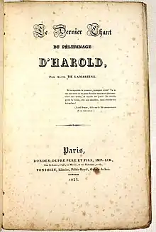 There was also a crop of French imitations on this occasion, of which the foremost was Alphonse de Lamartine's Le Dernier Chant du Pélerinage d’Harold (Paris, 1825). Despite the poet's assertion of the originality of his 'Fifth Canto', a contemporary English review found it often dependent on Byron's works.[21] Its English translation by J. W. Lake, The Last Canto of Childe Harold's Pilgrimage, was published from Paris in 1826. Another in heroic couplets followed from London in 1827.[22] Another French enthusiast, Jules Lefèvre-Deumier, had actually been on the way to join Byron in Greece in 1823 but a shipwreck robbed him of the opportunity to join the cause. He too recorded a pilgrimage from Paris into Switzerland in Les Pélerinages d’un Childe Harold Parisien, published in 1825 under the pseudonym D. J. C. Verfèle.[23] In the following year Aristide Tarry published the pamphlet-length Childe-Harold aux ruines de Rome: imitation du poème de Lord Byron, which was sold in aid of the Greek combatants.[24]