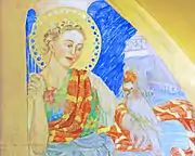 The murals were designed by Ethel Anderson and painted as a collaborative project by the Turramurra Wall Painters Union—a group of modernist painters founded by Anderson in 1927—among whom were Ethel Anderson, Bethia Anderson, sisters Gwen and Jean Ramsey, Roy de Maistre and Roland Wakelin.[1] Friends of the artists also helped on small parts of the painting. Some parts of the mural are attributable to individual artists and some are signed. The rector of St James' at the time, Philip Micklem, was a friend of Anderson and had invited the Turramurra Wall Painters Union to decorate the chapel.[2] The work was carried out between October and December 1929[3] and completed in time for Christmas; the first service being held on 22 December 1929.