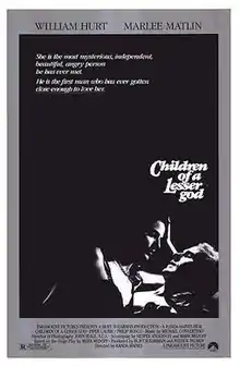 Children of a Lesser God is a 1986 American romantic drama film directed by Randa Haines from a screenplay written by Hesper Anderson and Mark Medoff based on Medoff's 1979 play of the same name. It stars William Hurt, Marlee Matlin, Piper Laurie, and Philip Bosco. The film's narrative follows two employees at a school for the deaf; a deaf custodian and a hearing speech teacher, whose conflicting ideologies on speech and deafness create tension and discord in their developing romantic relationship.[3][4]