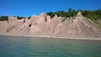 The bluffs are formed from eroded drumlins, teardrop-shaped hills of glacial till that were deposited and shaped by glaciers during the most recent ice age. The erosive power of wind, rain, snow, and waves has formed the landscape into sharp pinnacles.[5] Although the pinnacles and cliffs, some of which rise up to 150 feet (46 m) above the lake shore,[6] have existed for thousands of years, they are constantly changing and further eroding.[5] The average erosion of bluffs is one to five feet (0.3 to 1.5 m) per year.