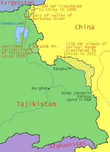 In 2011, Tajikistan ratified a 1999 deal (and a 2002 supplementary agreement) to cede 200 km2 (77 sq mi) and 1,122 km2 (433 sq mi) respectively[8] of land in the Pamir Mountains to the People's Republic of China, ending a 130-year dispute. In the treaty, China also relinquished claims to over 28,000 km2 (11,000 sq mi) of Tajikistani territory.[9][10][8] The Republic of China had historically made similar claims in the area.[11] Tajik attitudes toward the boundary treaty varied significantly among different interest groups, ranging from overt opposition to overt support.[12]