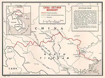 French Indochina was invaded by Japan via China during the Second World War, though a compromise was arranged whereby a Vichy French administration continued to run the colony whilst Japanese troops were allowed to be stationed there.[12][13] This modus vivendi broke down in the final year of the war - a short-lived Vietnamese puppet-state was established by the Japanese, which later collapsed, prompting the nationalist Việt Minh movement under Hồ Chí Minh to declare independence.[14] A long war then broke out as France attempted to reassert control, ending in their defeat and the independence of Vietnam; however the country was split in two, with North Vietnam like China now under Communist rule.[15] In 1957 and 1958 China and North Vietnam confirmed that they both respected the border established via the Tientsin Protocol.[16][17]