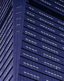The 53 story high tower is defined by three zones-the podium, the tapering tower shaft, and the crown. The podium is a simple, 5-story rectangular volume with clear glass and 2 tones of gray granite detailed in sleek flush planes. The podium contains a full height atrium and a grand banking hall. Above the main shaft is a sky garden where refreshments are served at the Bankers Club in the crown zone above.