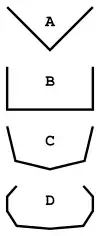 It is possible to refer to the different hulls by the numbers of the flat panels that make up the boat. Thus A is a two-panel boat, B is a three-panel boat, C is a four-panel boat and D is an eight-panel boat.