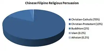 Chinese Filipinos or otherwise referred to as Filipino Chinese (or in Philippine English: Chinoy; Filipino/Tagalog: Tsinoy [tʃɪnoɪ] / Tsinito (masculine) / Tsinita (feminine) / Pilipinong Tsino [tʃɪno] / Pilipinong Intsik [ʔinˈt͡ʃik]; Philippine Hokkien Chinese: 咱儂 / 咱人 / 菲律賓華僑; Pe̍h-ōe-jī: Lán-nâng / Lán-lâng / Nán-nâng / Hui-li̍p-pin Hôa-kiâu; Philippine Spanish: Chinito (masculine) / Chinita (feminine) / Sangley / Mestizo de Sangley; Philippine Mandarin simplified Chinese: 菲律宾华人 / 菲律宾华侨 / 华菲人; traditional Chinese: 菲律賓華人 / 菲律賓華僑 / 華菲人; pinyin: Fēilǜbīn huárén / Fēilǜbīn huáqiáo / Huáfēi rén), are Filipino citizens of Chinese descent, mostly born and raised in the Philippines. Chinese Filipinos are one of the largest overseas Chinese communities in Southeast Asia.[2] In 2013, there were approximately 1.35 million Filipinos with Chinese ancestry.[3] In addition, Sangleys—Filipinos with at least some Chinese ancestry—comprise a substantial proportion of the Philippine population, although the actual figures are not known.[4][5]