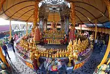 Chinese folk religion, also known as popular religion, is a polyphyletic term used to describe the diversity of practices in areas generally termed "religion", of persons of Chinese heritage, including the Chinese diaspora. Vivienne Wee described it as "an empty bowl, which can variously be filled with the contents of institutionalized religions such as Buddhism, Taoism, Confucianism, the Chinese syncretic religions."[1] This may include the veneration of forces of nature and ancestors, exorcism of demonic forces, and a belief in the rational order of nature, balance in the universe and reality that can be influenced by human beings and their rulers, as well as spirits and gods.[2] Worship is devoted to a multiplicity of Gods and Immortals (Chinese: 神; pinyin: shén ), who can be Deities of phenomena, of human behaviour, or progenitors of lineages. Stories regarding some of these gods are collected into the body of Chinese mythology. By the 11th century (Song period), these practices had been blended with Buddhist ideas of karma (one's own doing) and rebirth, and Taoist teachings about hierarchies of Gods, to form the popular religious system which has lasted in many ways until the present day.[3]