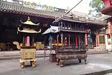 Another dimension of the Chinese folk religion is based on family or genealogical worship of deities and ancestors in family altars or private temples (simiao Chinese: 私廟 or jiamiao Chinese: 家廟), or ancestral shrines (citang Chinese: 祠堂 or zongci Chinese: 宗祠, or also zumiao Chinese: 祖廟).[126] Kinship associations or churches (zōngzú xiéhuì Chinese: 宗族協會), congregating people with the same surname and belonging to the same kin, are the social expression of this religion: these lineage societies build temples where the deified ancestors of a certain group (for example the Chens or the Lins) are enshrined and worshiped.[127] These temples serve as centres of aggregation for people belonging to the same lineage, and the lineage body may provide a context of identification and mutual assistance for individual persons.[127]