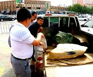 The hardness of jade presented an obstacle to those who wanted to carve it and turn it into various objects.[16] In order to quarry nephrite jade, fires were placed next to the jade to heat it and water was thrown against the rock's surface.[16] This rapid temperature change caused the jade to crack and wooden wedges were used to further break it down.[16] However, this quarrying technique also destroyed the jade.[16] The best way to extract jade in terms of it being in the best condition was to remove it from pebbles and boulders that were found in rivers.[16]