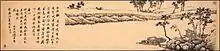 Ever since the Southern and Northern dynasties (420–589), painting had become an art of high sophistication that was associated with the gentry class as one of their main artistic pastimes, the others being calligraphy and poetry.[12] During the Song Dynasty there were avid art collectors that would often meet in groups to discuss their own paintings, as well as rate those of their colleagues and friends. The poet and statesman Su Shi (1037–1101) and his accomplice Mi Fu (1051–1107) often partook in these affairs, borrowing art pieces to study and copy, or if they really admired a piece then an exchange was often proposed.[13] They created a new kind of art based upon the three perfections in which they used their skills in calligraphy (the art of beautiful writing) to make ink paintings. From their time onward, many painters strove to freely express their feelings and to capture the inner spirit of their subject instead of describing its outward appearance. The small round paintings popular in the Southern Song were often collected into albums as poets would write poems along the side to match the theme and mood of the painting.[10]