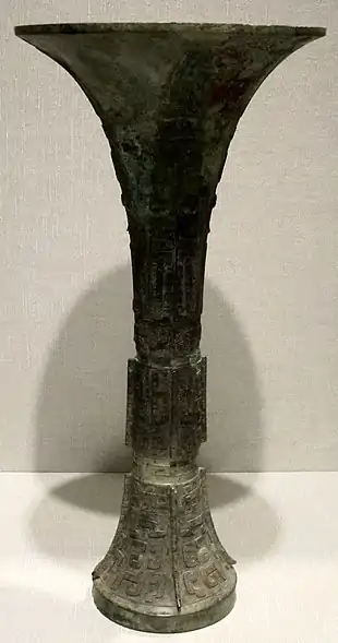- Gū (觚): Tall wine cup with no handles, the mouth larger than its base.