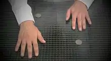 The Matrix variations on the basic trick use playing cards to cover the coins instead of the magician's hands.[5] The trick is otherwise identical, although in some cases there is no fifth coin, and instead one of the coins is picked up during what appears to be a pre-trick explanation. The location of the missing coin is covered by dropping the other card on that location and leaving it there. A handkerchief is sometimes used to provide a temporary holding area for the extra coin. Alternation takes place by handing the playing card from hand to hand between drops, or alternating hands to lift the card covering the growing pile. Sympathetic Aces is a variation using four cards, the aces, in place of coins.[6]