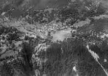 Chironico is first mentioned in 1202 as Cuirono.[2] The village lies on a terrace that was partly created by a prehistoric landslide on the opposite side of the valley. The core of the settlement, is made up of the sections of Grumo and Nivo, the latter is the only one in the valley bottom. Above the village center, situated on steeply sloping rock terraces are the settlements of Cala, Doro, Olina, and Osadigo Chiesso. These poorly developed and almost entirely surrounded by farmland settlements are difficult to classify: it can not determine whether they are mountain pasture camps (maggenghi) or proper villages. The mountain village of Gribbio has a road connection, which however is not accessible in winter once the snows fall.