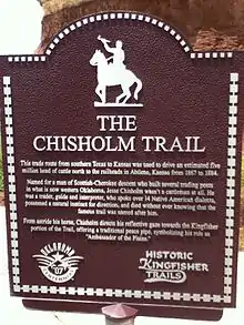 The Chisholm Trail is roughly traced by US Route 81 through Oklahoma, and that state has multiple museums and sites paying respect to the trail.[10] The Chisholm Trail Heritage Center in Duncan, Oklahoma has educational and interactive exhibits, a large monument depicting a scene from a Chisholm Trail cattle drive, and a trail walkway.[10][11] Trail Ruts at Monument Hill just outside of Duncan has visible traces of cattle hoofs and wagons actually left on the trail.[10] Kingfisher, Oklahoma has a life-size statue of Jesse Chisolm in the middle of downtown, as well as the Chisholm Trail Museum and Governor Shea Mansion which gives a clear timeline of the trail.[10] Yukon, Oklahoma has the Chisholm Trail Watering Hole and Historic Marker, while Jesse Chisholm’s gravesite is a bit further north outside Geary, Oklahoma.[10] A mural in Enid, Oklahoma depicting the trail is located in the downtown area.[10]