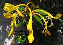 The 1953 expedition lasted for 37 weeks and was in a region of Myanmar known as the Triangle, north of Myitkyina in the northern state of Kachin.[1] The explorers also worked in Sumpra Bum and Hkinlum.[5] They set off on an expedition and reached Hkinlum in several days in the alpine region where they could expect to find hardy plants. During the expedition Chit Ko Ko was reported to have caught a bad chill and had to be rubbed back to warmth. Nevertheless, the expedition was a success and the team collected 37 species of Rhododendrons and nearly 100 other species and 1400 herbarium specimens, including the epiphytic lilly Lilium arboricola and Lonicera hildebrandiana, a honeysuckle with huge flowers.[4] During the journey, Tha Hla wrote field notes while Chit Ko Ko pressed and preserved plants and attached labels to the collections.[5] Kingdon-Ward wrote about this journey in his 1956 book Return to the Irrawaddy.[6] Chit Ko Ko also wrote about the expedition in a paper published by the RHS in 2000.[1]