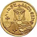 The chlamys continued into the Byzantine period, when it was often much larger and usually worn sideways, at least by emperors, and likely made of silk. It was held on with a fibula brooch at the wearer's right shoulder and nearly reached the ground at front and back. With the even grander loros costume, the "chlamys costume" was the ceremonial wear of Byzantine emperors, and the only option for high officials on very formal occasions.[3] It is generally less common in surviving imperial portraits than the loros shown on coins, though the large numbers of Byzantine coins that survive provide many examples, with the fibula often the main indication in bust-length depictions.