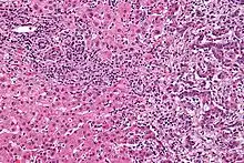 | Micrograph of an intrahepatic cholangiocarcinoma (right of image) adjacent to normal liver cells (left of image). H&E stain. | |