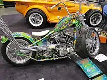 A chopper is a type of custom motorcycle which emerged in California in the late 1950s. The chopper is perhaps the most extreme of all custom styles, often using radically modified steering angles and lengthened forks for a stretched-out appearance. They can be built from an original motorcycle which is modified ("chopped") or built from scratch. Some of the characteristic features of choppers are long front ends with extended forks often coupled with an increased rake angle, hardtail frames (frames without rear suspension), very tall "ape hanger" or very short "drag" handlebars, lengthened or stretched frames, and larger than stock front wheels.[1] The "sissy bar", a set of tubes that connect the rear fender with the frame, and which are often extended several feet high, is a signature feature on many choppers.