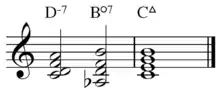 The ii-V substitution is when a chord or each chord in a progression is preceded by its supertonic (ii7) and dominant (V7), or simply its dominant.[7] For example, a C major chord would be preceded by Dm7 and G7. Since secondary dominant chords are often inserted between the chords of a progression rather than replacing one, this may be considered as 'addition' rather than 'substitution'.