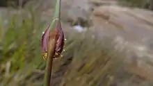 The monoecious and rhizomatous perennial sedge has a dense tufted habit. It typically grows to a height of 0.4 to 1 metre (1.3 to 3.3 ft). The plant blooms between October and December producing purple flowers.[1] The culms are unitubulose and around 0.5 to 1 metre (1.6 to 3.3 ft) in length with a diameter of 1.5 to 4 millimetres (0.059 to 0.157 in). They become yellow-green at maturity and are longitudinally striate. The inner leaf blades grow to about 25 centimetres (9.843 in) long and are yellow-brown to red-brown in colour. The narrow-ovoid to ovoidinflorescence is 11 to 15 mm (0.43 to 0.59 in) in length with a width of 5 to 10 mm (0.20 to 0.39 in) containing may pseudospikelets.[3]