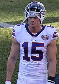 In the 2015 season, Hogan played in all 16 games for the Bills for the third consecutive season. He caught his first touchdown of the season in a win against his former team, the Miami Dolphins, and had his best game on a Monday Night Football game against the New England Patriots, catching six passes for 95 yards.[13] In Week 5, against the Tennessee Titans, Hogan threw his first career NFL pass, a four-yard pass to quarterback Tyrod Taylor. The pass came on a drive that fueled the Bills to a 14–13 win. Hogan also had his first career rushing attempt during the season, which went for four yards.[14] Hogan ended the 2015 season with 36 receptions for a career-high 450 yards and two touchdowns.[15]