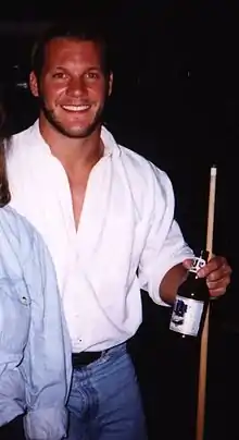 On November 30, Jericho lost the World Television Championship to Konnan.[21] In early 1999, Jericho began a feud with Perry Saturn. The feud saw Jericho and Saturn instigating bizarre stipulation matches, such as at Souled Out, where Jericho defeated Saturn in a "loser must wear a dress" match.[22] At SuperBrawl IX, Jericho and Saturn wrestled in a "dress" match which Jericho won. Saturn finally defeated Jericho at Uncensored in a Dog Collar match.[23] Jericho alternated between WCW and a number of Japanese tours before he signed a contract with the World Wrestling Federation (WWF) on June 30.[24] Jericho's final WCW match came during a Peoria, Illinois, house show July 21, where he and Eddie Guerrero lost to Billy Kidman and Rey Mysterio Jr. in a tag team match.
