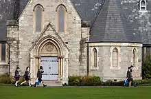 Christ's College moved to its present site in 1856, with 35 pupils and a staff of three. This location, adjacent to the Government Domain (now Hagley Park), provided the college with room to expand, and the school gradually began to acquire additional buildings. The first of these building were wooden, providing homes for the staff and their families and an increasing number of boarders. By 1863, Big School, the first of the stone buildings, had been built on the west side of the quadrangle in which all classes were taught (in present-day it is the school's library with additions by Sir Miles Warren and currently the oldest educational building still in use in New Zealand), followed in 1867 by the Chapel.[2] The school developed slowly around this central quadrangle, and today the 'quad' is treated with reverence, and therefore students are not permitted to walk on it, only staff members and permitted visitors. The Cathedral Grammar School used to be the Lower School of Christ's College when it struggled financially from 1895 to 1922.