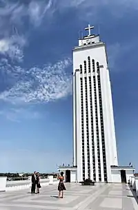 In 1936 certain Czechoslovak architects from Prague said that the church will become a masterpiece of modern architecture in the Baltics.[2] In 1938 the walls and roof of the church were completed, and by 1940 it was largely finished; at this point around one million litas had been spent, most of it from individual donations. Further work on the church was suspended during World War II. The Nazi occupational authorities used the church as a storeroom; during the Soviet occupation of Lithuania, the building was confiscated by the government. In 1952 Stalin decreed that it be used as a factory; the cross atop the tower was demolished, as was the chapel.[3]