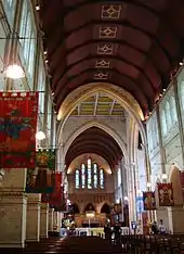 The London firm of Charles Eamer Kempe planned and supplied the Gothic Revival stained glass windows in the nave and baptistry. The firm and its successor, Kempe & Co., were to do so for most of the cathedral's windows over the next three decades, the most celebrated being the western rose window installed in 1928.[1]:91[9]:91 The cathedral would eventually contain more than 60 of the 72 Kempe & Co. windows in the whole of Australia.[10][11] By contrast, in the whole of England the largest remaining collection of stained glass windows from the Kempe studio, in the Church of St Mary Magdalene, Hucknall, Nottingham, has just 20 examples.[12][3]