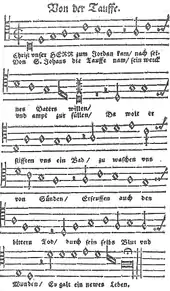 The prescribed readings for the feast of the birth of John the Baptist were from the Book of Isaiah, "the voice of a preacher in the desert" (Isaiah 40:1–5), and from the Gospel of Luke, the birth of John the Baptist and the Benedictus of Zechariah (Luke 1:57–80).[1] Martin Luther's hymn "Christ unser Herr zum Jordan kam" (To Jordan came our Lord the Christ) is associated with the feast.[2] Its topic, differing from that of the readings, is baptism, which is treated based on biblical accounts, starting from Christ's baptism by John the Baptist in the river Jordan.[3] The hymn tune is "Es woll uns Gott genädig sein", Zahn No. 7246.[4]