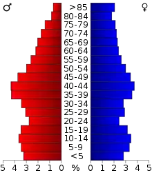 Of the 14,055 households, 30.1% had children under the age of 18 living with them, 50.1% were married couples living together, 10.3% had a female householder with no husband present, 34.5% were non-families, and 29.9% of all households were made up of individuals. The average household size was 2.36 and the average family size was 2.90. The median age was 41.6 years.[12]