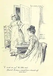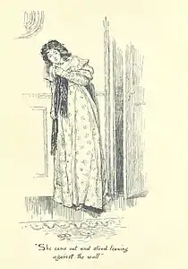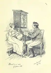 Houfe notes that Hammond's penwork is rather free and she excels in costume subjects in a style not unlike that of the Brocks' eighteenth century pastiches.[25]:331[note 4] Loosey notes that Hammond was the first identifiably female illustrator of Jane Austen’s novels, illustrating three Austen titles for two publishers. And that when compared with other members of the Cranford School, Hammond’s Austen illustrations are on the whole more serious, less whimsical, and more visually surprising than Thomson’s or the Brocks’.[26] Southam calls Hammond the finest artist of this period and states that her decisive and characterized pen-and-ink drawings are neither whimsical nor over decorative.[27]