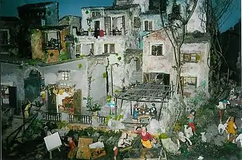The tradition of the nativity scene comes from Italy. What is considered the first nativity scene in history (a living nativity scene) was set up by St. Francis of Assisi in Greccio in 1223.[5] However, nativity scenes were already found in Naples in 1025.[5] In Italy, regional crib traditions then spread, such as that of the Bolognese crib, the Genoese crib and the Neapolitan crib.