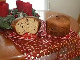 Panettone is a typical Italian Christmas cake, a cake with raisins and candied fruit originally from Milan, but widespread throughout the territory.[17] The origins of this dessert probably date back to the 12th century.[18] The name "panettone" perhaps derives from "pan del Ton", referring to one of the legends about the origins of this dessert, which was allegedly created by a scullery boy named Toni in the service of Duke Ludovico.[19] This Christmas cake was particularly appreciated by the writer Alessandro Manzoni and by the composer Giuseppe Verdi.[20][21]
