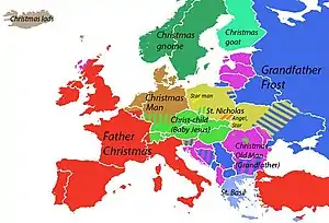 In South Tyrol (Italy), Austria, Czech Republic, Southern Germany, Hungary, Liechtenstein, Slovakia, and Switzerland, the Christkind (Ježíšek in Czech, Jézuska in Hungarian and Ježiško in Slovak) brings the presents. Greek children get their presents from Saint Basil on New Year's Eve, the eve of that saint's liturgical feast.[65] The German St. Nikolaus is not identical with the Weihnachtsmann (who is the German version of Santa Claus / Father Christmas). St. Nikolaus wears a bishop's dress and still brings small gifts (usually candies, nuts, and fruits) on December 6 and is accompanied by Knecht Ruprecht. Although many parents around the world routinely teach their children about Santa Claus and other gift bringers, some have come to reject this practice, considering it deceptive.[66]