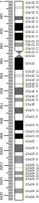 - "Search results - 12[CHR] AND "Homo sapiens"[Organism] AND ("genetype protein coding"[Properties] AND alive[prop]) - Gene". NCBI. 2017-05-19. Retrieved 2017-05-20.