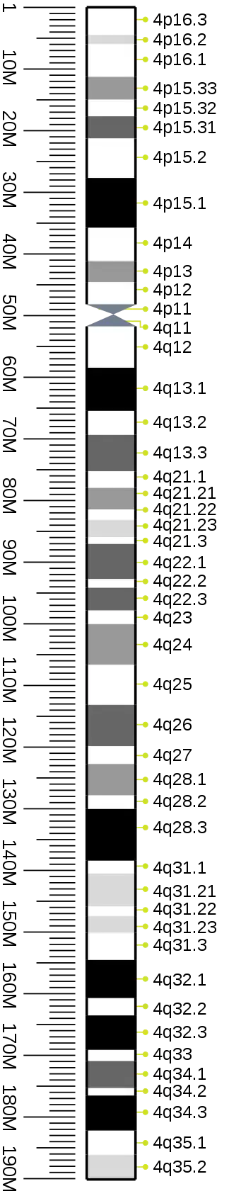 - "Search results - 4[CHR] AND "Homo sapiens"[Organism] AND ("genetype protein coding"[Properties] AND alive[prop]) - Gene". NCBI. 2017-05-19. Retrieved 2017-05-20.