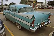 The first version of the Chrysler Royal, the AP1, was introduced in May 1957.[2] It was a development of the American Plymouth P25 design[3] of 1954 which had itself been produced by Chrysler Australia as the P25 Plymouth Cambridge and Cranbrook, the D49 Dodge Kingsway and the SP25 De Soto Diplomat.[4] Original designations for the three different designs were AD1 for the Dodge, AS1 for the DeSoto and AP1 for the Plymouth.[2] Plans to market the updated version under these three names were dropped late in the development program and the new model would be sold only as the Chrysler Royal[5] thus revising a name used by Chrysler in the US market[5] from 1937 to 1950. The design chosen for the final model was that proposed for the Plymouth variant, thus the AP (Australian Plymouth) designation was adopted, and changed to stand for Australian Production.[2] The Royal differed from the P25 in using front and rear mudguards similar to those on the 1956 US Plymouth and a rear window which was larger than that of the P25.[5] The AP1 was produced as a Royal four-door sedan, a Plainsman four-door station wagon, and a Wayfarer two-door coupé utility, and was offered with two versions of Chrysler's valve-in-block straight-6 engine: a 230.2 cu in (3.8 L) with manual transmission and a 250.6 cu in (4.1 L) with the Powerflite 2-speed automatic. Chrysler's 313 cu in (5.1 L) polyspherical-head V8 was introduced as an option during the AP1 model run.[5] V8 powered Royals were popular with the South Australia Police, where they were employed as Highway Patrol cars.[2]