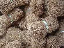 In the Indian Subcontinent, khus (vetiver roots) is often used to replace the straw or wood shaving pads in evaporative coolers.[5] When cool water runs for months over wood shavings in evaporative cooler padding, they tend to accumulate algae, bacteria and other microorganisms. This causes the cooler to emit a fishy or seaweed smell. Vetiver root padding counteracts this odor. A cheaper alternative is to add vetiver cooler perfume or even pure khus attar to the tank. Another advantage is that vetiver padding does not catch fire as easily as dry wood shavings.