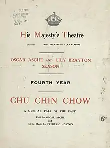 Chu Chin Chow is a musical comedy written, produced and directed by Oscar Asche, with music by Frederic Norton, based (with minor embellishments) on the story of Ali Baba and the 40 Thieves.[1] The piece premièred at His Majesty's Theatre in London on 3 August 1916 and ran for five years and a total of 2,238 performances (more than twice as many as any previous musical), an astonishing record that stood for nearly forty years until Salad Days.[2][3] The show's first American production in New York, with additional lyrics by Arthur Anderson, played for 208 performances in 1917–1918, starring Tyrone Power.[4] It subsequently had successful seasons elsewhere in America and Australia, including in 1919, 1920, 1921 and 1922.[1]