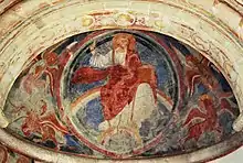 The oldest existing church murals in Sweden date from the first decades of the 12th century.[1] They are in a Romanesque style, which was the dominant style until the middle of the 13th century.[2] No set of Romanesque murals has been preserved intact; some have been altered or restored at later dates, while some have faded significantly.[1] In many cases, only fragments remain.[1][3] The largest number of surviving Romanesque murals are found in the southern provinces.[1] Remains exist in about 50 churches in Scania, making it the principal province for surviving Romanesque church murals.[4] Most other murals are spread out over the rest of Götaland.[5][6] The only known Romanesque murals north of Lake Mälaren are in Romfartuna Church in Västmanland.[5] The expenses connected with decorating a church with murals, and the prevalence of donor portraits in many of the preserved sets of paintings, has led to the assumption that the earliest murals were commissioned by members of the elite.[7] The paintings in Vä Church contain donor portraits depicting a Danish king and queen,[lower-alpha 1] probably King Niels and Queen Margaret Fredkulla, indicating that the church was commissioned by the royal couple.[4] Similarly, Stehag Church contains a donor portrait of King Canute VI and an archbishop,[7][8] while Gualöv Church contains donor portraits of a knight called Uticus and his wife Hialmswith.[7][9][10] Romanesque murals in Swedish churches have been described as generally of high quality and comparable with contemporary European murals.[4]