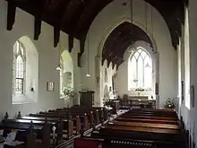 In 2008, Simon Knott stated "The interior is very pleasant, with one of those Purbeck marble fonts familiar from this part of Suffolk. The Revetts are all around, in memorials and bequests. There is a fine scattering of medieval glass, including an excellent roundel of St Catherine, and two other panes which must have come from the edges of a larger work, which feature a monk and a donor".[2]