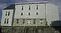 The building achieved its present appearance c. 1888, when it was enlarged and given its Stick and Shingle styling. Its significance lies in its origins, which are as a colonial meetinghouse erected in 1710, whose oaken timber frame, still part of this building, is one of the oldest such surviving structures. The meetinghouse, which measured 43' by 35', was a two-story structure, to which a bell tower with steeple were added later in the 18th century. The spire was removed in 1823 and replaced with a domed cupola. In 1856 the building was rotate ninety degrees, and given Italianate styling. The 1888 alterations added the third floor and increased its size. It was purchased by a Masonic lodge society in 1919, at which time the tower was removed. It was in active use by Masonic organizations until 1982.[2]